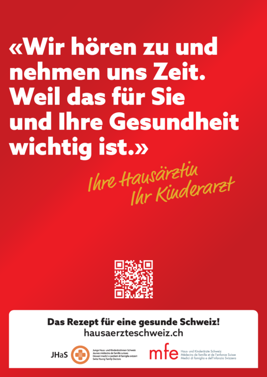 Damit dieser Wert der Hausarztmedizin allen Beteiligten bewusst wird, lanciert mfe gemeinsam mit JHaS eine Imagekampagne. Die Imagekampagne unterstützt unsere politische Arbeit. Unsere Arbeit für eine dezentrale, niederschwellige ärztliche Grundversorgung, von der wir überzeugt sind, dass sie das richtige Rezept ist für eine gesunde Schweiz. Und das kosteneffizienteste.