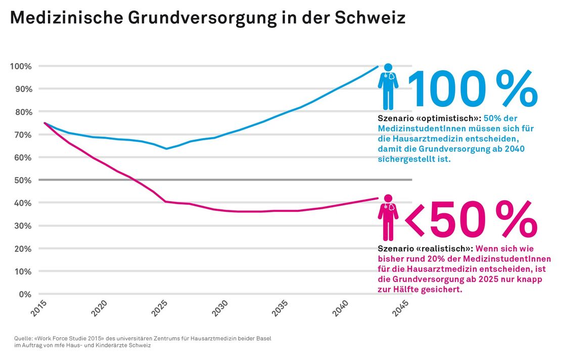 Dem gegenüber steht die Tatsache, dass bereits heute über 2'000 Vollzeit-HausärztInnen fehlen, um die empfohlene Versorgung von einem Hausarzt für 1'000 EinwohnerInnen (OECD-Forderung) zu erreichen. Dies zeigt die «Work Force Studie 2015» des universitären Zentrums für Hausarztmedizin beider Basel. Die alle fünf Jahre im Auftrag von mfe durchgeführte Erhebung prognostizierte massive Versorgungslücken.